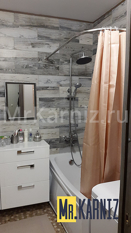 Компания Mr.Karniz производит штанги для ванных комнат, которым можно придать любую форму. Материалом таких изделий является особый вид алюминия. Часто гибкие карнизы для ванной используются в стандартных, круглых, полукруглых комнатах. Монтируются к стенам или потолку (если конструкция последнего это позволяет).
