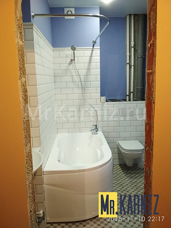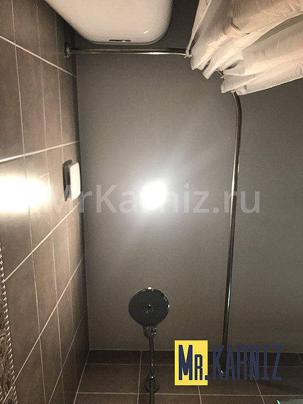 Основой штанги является цельная стальная труба. На этапе производства ей задают требуемую форму, ориентируясь на размеры бортика ванны. Крепят карниз на кронштейны, закрепленные в стенах саморезами/шурупами, или на поворачиваемые крепления к потолку. Второй способ используется реже.